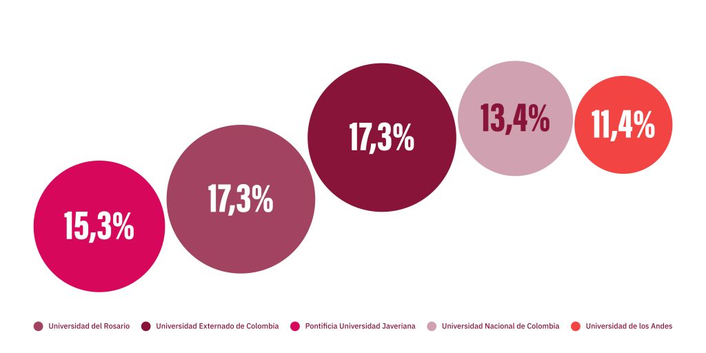 - Una quinta parte de quienes han ocupado magistraturas proviene de solo dos universidades: el Rosario y el Externado.